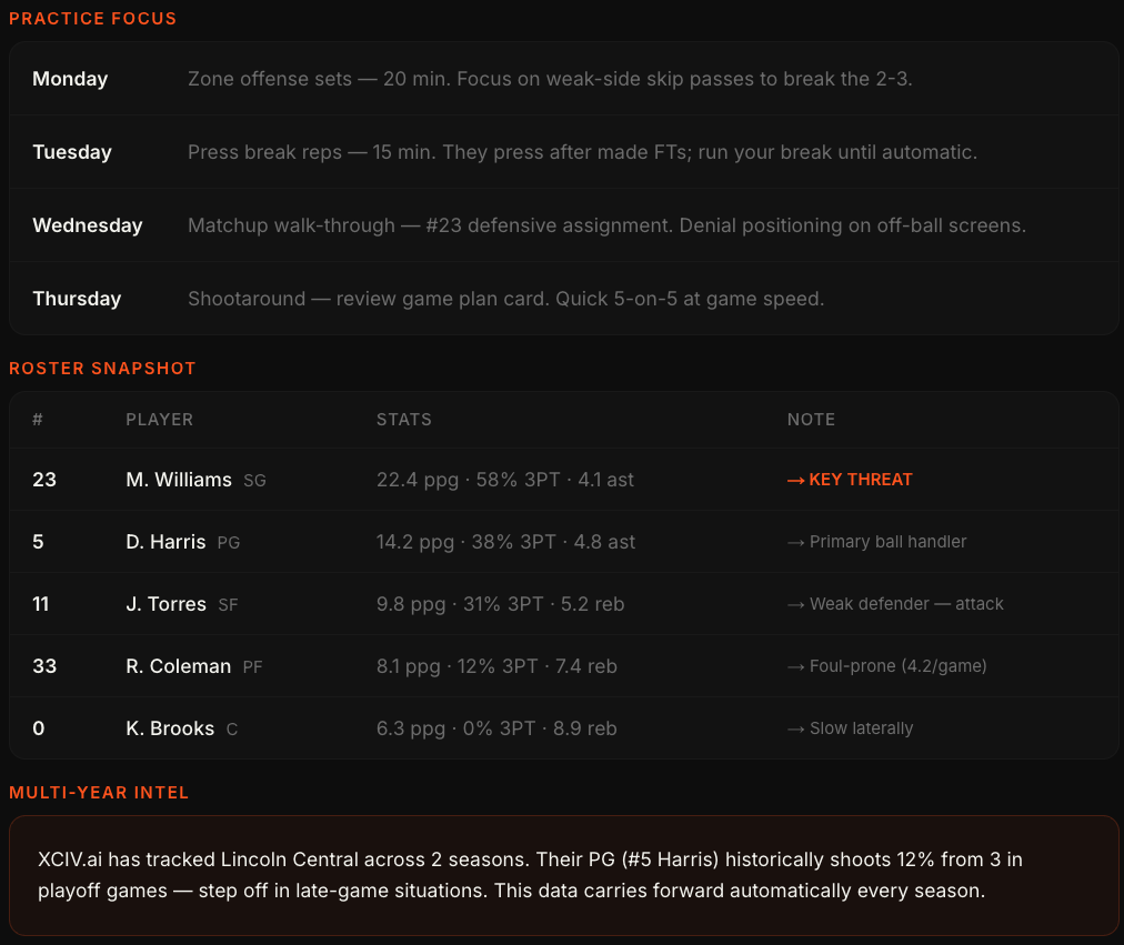 XCIV.ai is the high school basketball scouting app built for this exact workflow. Upload your next box score — free Starter tier, no credit card required. Start building your first game plan →